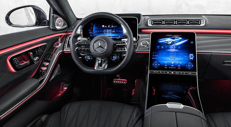 The performance sedan looks more aggressive than its regular sibling, with a range of vertical louvers on the grille and an AMG sign finished in chrome and black. The rear has four trapezoidal exhaust tips and a diffuser. The comfortable four-seat interior welcomes the MBUX infotainment system, a head-up display, and so much more.